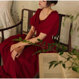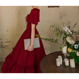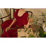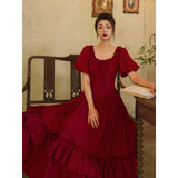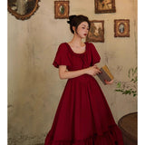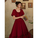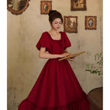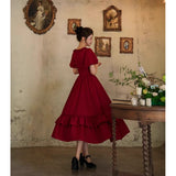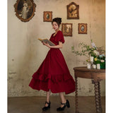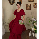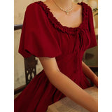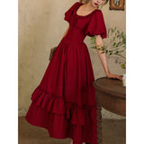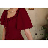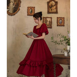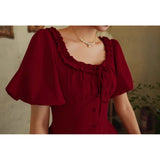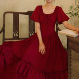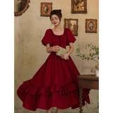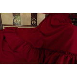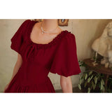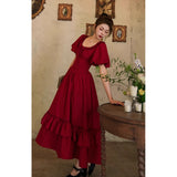 情熱的でロマンティックな赤。丹念なクラフトワークとたっぷりの生地量で仕立てられたワンピース。スクエアネックにはフリルが施されており、袖部分は膨らみのあるデザイン。コルセットを施したようなウエストは、どこから見ても美しい曲線が生まれ、ふんわりと広がるスカート部分と、段になったボリューミーなフリルが、優雅でノスタルジックなシルエットを演出してくれる。まさに死角なしの美しさ。