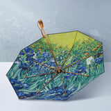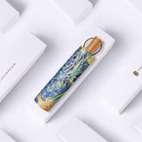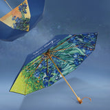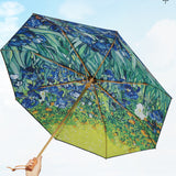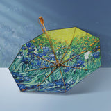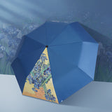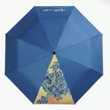 ゴッホの『アイリス』を描いた晴雨兼用の折りたたみ傘。青紫色のアイリスと輝くように群れ咲いた黄色いきんぽうげが描かれています。輝かしい光を湛えた南仏のサンレミにいるみたい。生地は日差しを遮ってくれる二層構造となっています。日差しの強い日も、雨の日もお使いいただけます。アートな柄が暑い日も、雨の日も気分をあげてくれる。