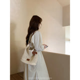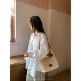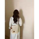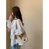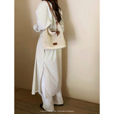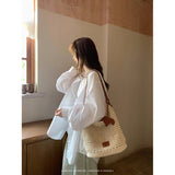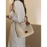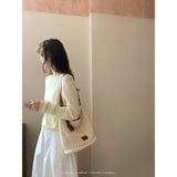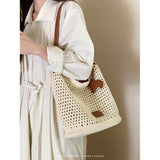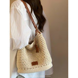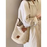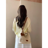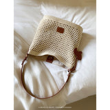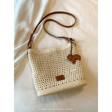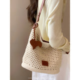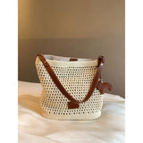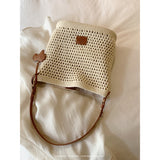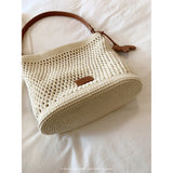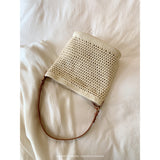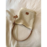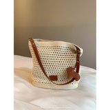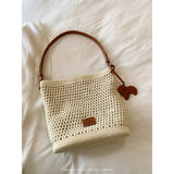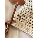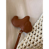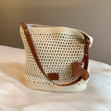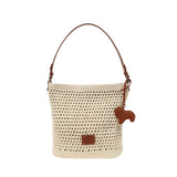 ナチュラルなベージュカラーの編み込みショルダーバッグ。柔らかな風合いが特徴的で、ブラウンレザーのストラップとゾウさんのチャームがアクセントとなっています。ヴァケーション気分を高めてくれるアイテム。カジュアルでリラックスした雰囲気を醸し出しています。