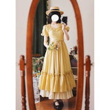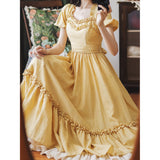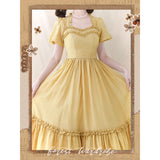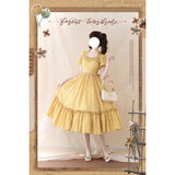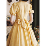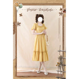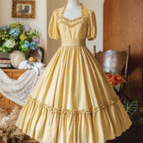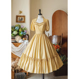 舞踏会に誘われたお嬢様みたいに演出してくれるクラシカルなワンピース。スクエアネックとハート型に添う胸元のフリル装飾がロマンティックで、パフスリーブが柔らかな印象を与えます。ウエストをしっかりマークするウエストリボンと、後ろで結ぶ大きなリボンがシルエットにメリハリを与え、裾にかけて広がるティアードスカートには控えめなギャザーフリルがあしらわれ、動くたびにふんわり揺れる優雅さがあります。深紅の絨毯が敷き詰められたお屋敷で開かれる舞踏会へ出かけましょう。