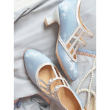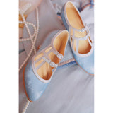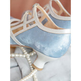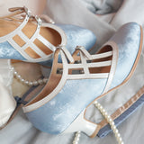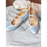 透きとおるような透明感のある水色のメリージェーンパンプス。白地のストラップが交差するデザインで、モダンな幾何学的要素が取り入れられています。ストラップの留め具部分には、小さなビジューが施されています。熟練の職人によって丁寧に縫製されたアイテム。