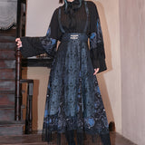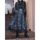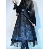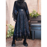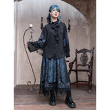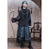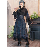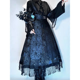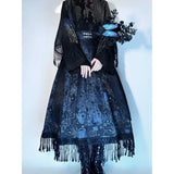 海に浮かぶ月。夜空の月が海に映り、静かに浮かんでいるような神秘的なクラゲを描いたストラップスカート。深藍の光沢感あるダークパターン生地と、クラゲが描かれた生地の二層構造となっており、奥行きあるレイヤードデザイン。夜の海を砕いて閉じ込めたような幻想的な雰囲気を放っています。