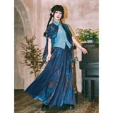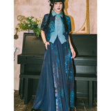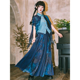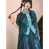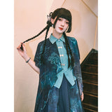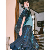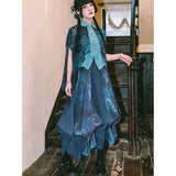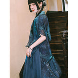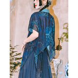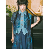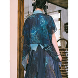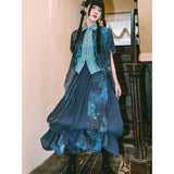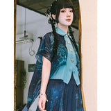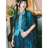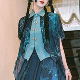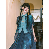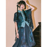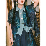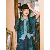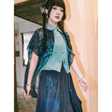 深藍の海に静かに浮かんでいるような神秘的なクラゲを描いたブラウス。軽やかで透け感のある蝶々のような軽やかさを持つシースルーの羽織を重ねたデザイン。月明かりに照らされて、海の中で小さく青く光る星雲が幻想的な雰囲気を醸し出しています。