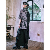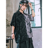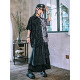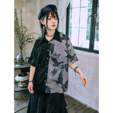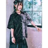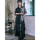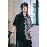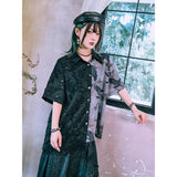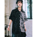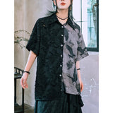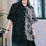 終焉を誘う羽音が聞こえてくるみたい。 黒い羽と鋭い眼差しを纏った鴉を水墨画で描いたアシンメトリーなシャツ。右半分は立体感のある黒のフリンジジャカード生地、左半分はグレー地に鴉の水墨画が描かれています。独特な生地感と左右非対称のデザインが、アートな雰囲気を醸し出しています。