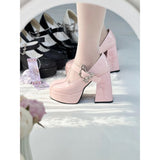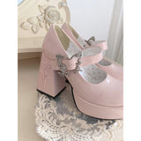 幻想的な世界観を落とし込んだゴシックヒールパンプス。ヒールには立体的な薔薇のエンボス加工が施され、まるで彫刻のような美しさを演出しています。アンクルストラップには銀色の蝶と薔薇のメタルパーツがあしらわれ、可憐さと荘厳さを同時に纏っています。