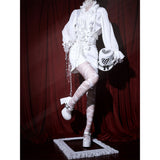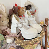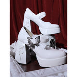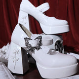 幻想的な世界観を落とし込んだゴシックヒールパンプス。ヒールには立体的な薔薇のエンボス加工が施され、まるで彫刻のような美しさを演出しています。アンクルストラップには銀色の蝶と薔薇のメタルパーツがあしらわれ、可憐さと荘厳さを同時に纏っています。