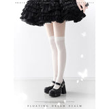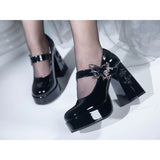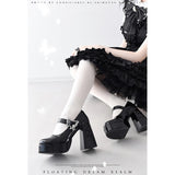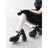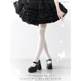 幻想的な世界観を落とし込んだゴシックヒールパンプス。ヒールには立体的な薔薇のエンボス加工が施され、まるで彫刻のような美しさを演出しています。アンクルストラップには銀色の蝶と薔薇のメタルパーツがあしらわれ、可憐さと荘厳さを同時に纏っています。