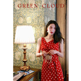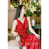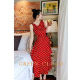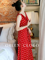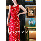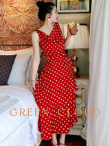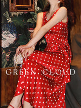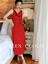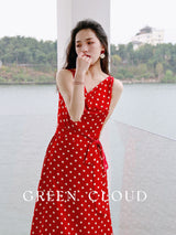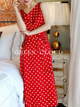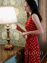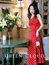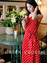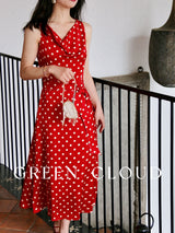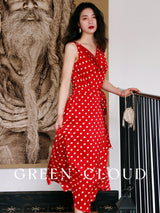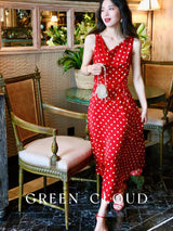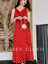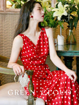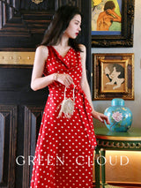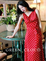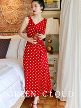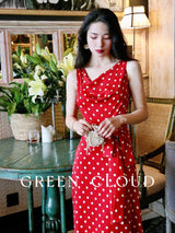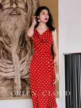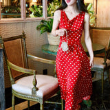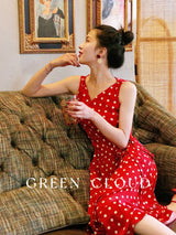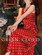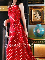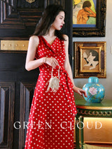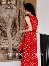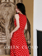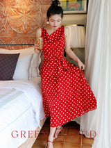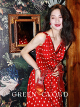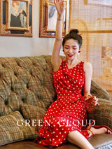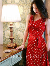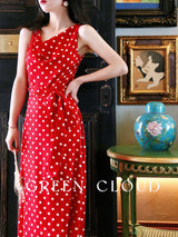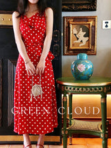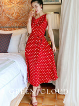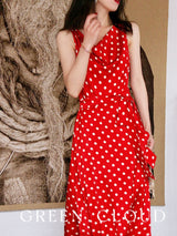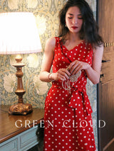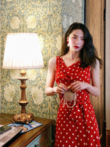 艶めく赤が美しい水玉模様のレトロなワンピース。上品な女性らしさとロマンティックな雰囲気が漂うアイテムです。ドレープ感のある生地となっています。ウエストリボンをキュッと巻いて、エレガントな淑女に。
