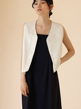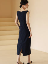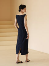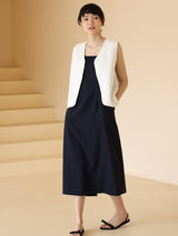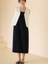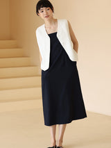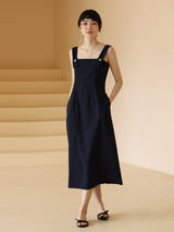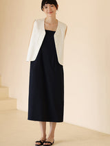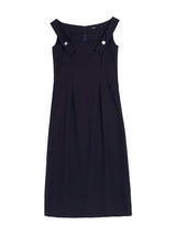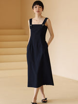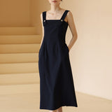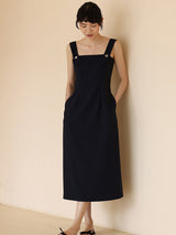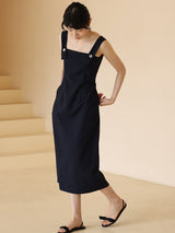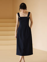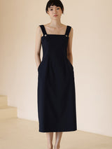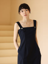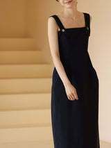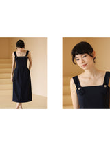 限りなく黒に近い濃紺色のストラップワンピース。肩紐はボタンで留めれるようになっています。ストンとしたシルエットで、綺麗に着こなすことができます。ショートジャケットやカーディガンを羽織っても素敵。カジュアルながらも、上品な印象が漂うアイテムです。