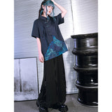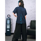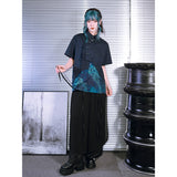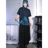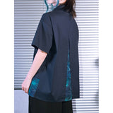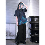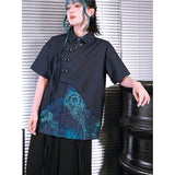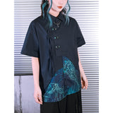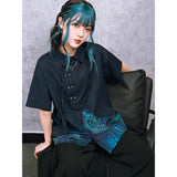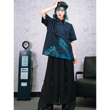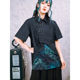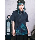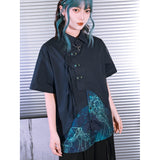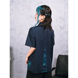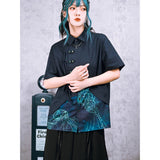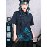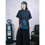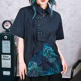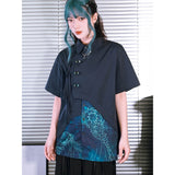 深藍の海に静かに浮かんでいるような神秘的なクラゲを描いたアシンメトリーなブラウス。装飾されたチャイナボタンが印象的。月明かりに照らされて、海の中で小さく青く光る星雲が幻想的な雰囲気を醸し出しています。