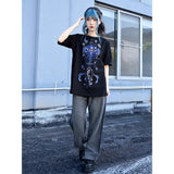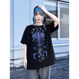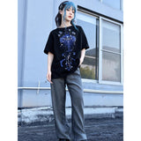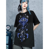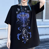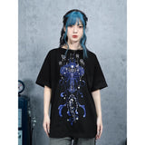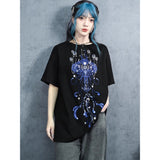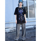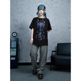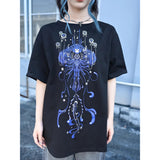 海面を漂うクラゲや、咲き乱れる花々、こぼれ落ちる涙などの要素を組み合わせた神秘的なデザインのTシャツ。触手のように垂れ下がる模様が幻想的。ゆったりとしたシルエットとなっており、アーティスティックでミステリアスな雰囲気を纏っています。