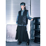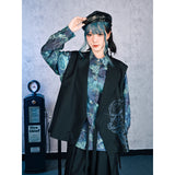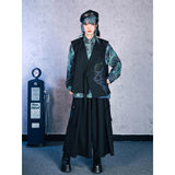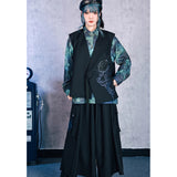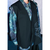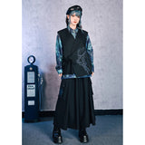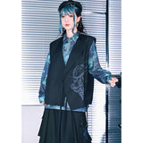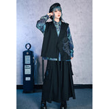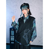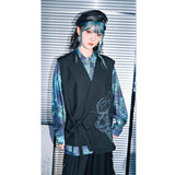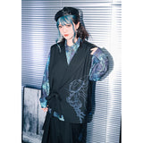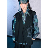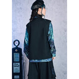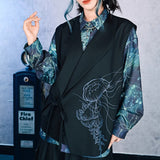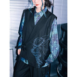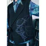 ゆらゆらと静かに浮かんでいるような神秘的なクラゲを描いたアシンメトリーなベスト。シルエットは和装ベストを思わせるラップデザインで、サイドで結ぶリボンがアクセントになっています。ゆったりとしたフォルムながら、クラゲが存在感を放ち、深海のような幻想的な雰囲気を纏わせています。