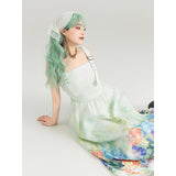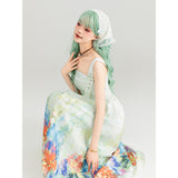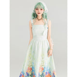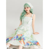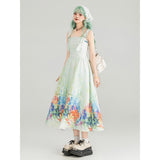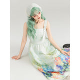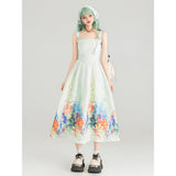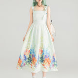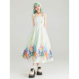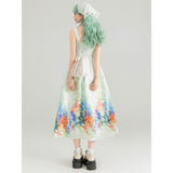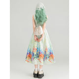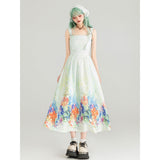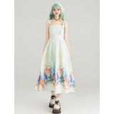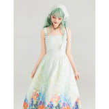 大地の微笑が咲き乱れる、七色の華やかな楽園の庭。眩しく鮮やかな色彩の宝石箱のようなお花畑を油彩画で描いたジャンパースカート。ゆったりとしたドレープ感のあるシルエット。爽やかな風に吹かれているような、優しく柔らかな夢の絨毯。