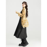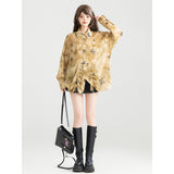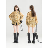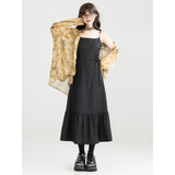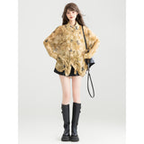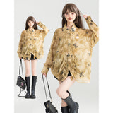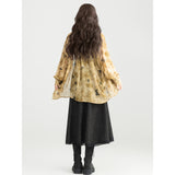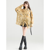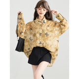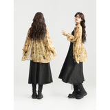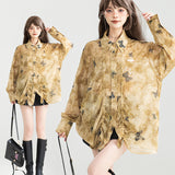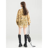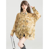 黄昏時の空を舞う蝶々を描いたシフォンブラウス。軽やかで透け感のある素材が特徴で、ルーズなシルエットとドロップショルダーのデザインが、抜け感のあるスタイリングを演出します。裾にはドローコードが付いており、シルエットを調整できるデザインとなっています。