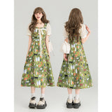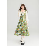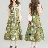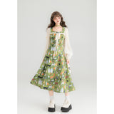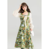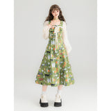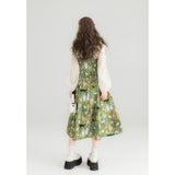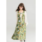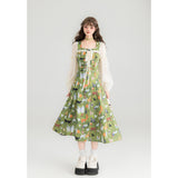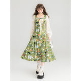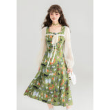 野原を犬たちが自由に駆け回っている様子を描いたドッキングワンピース。描かれた犬たちは、牧歌的で愛らしい雰囲気を演出しています。ジャンパースカートとブラウスを組み合わせたデザインで、胸元には華奢なリボンが飾られています。