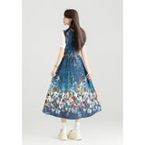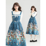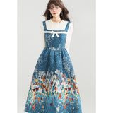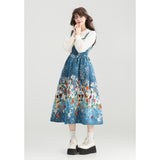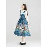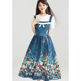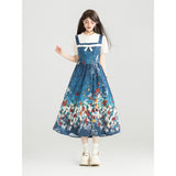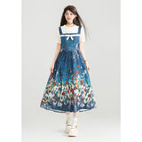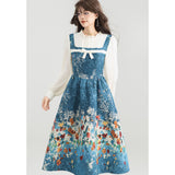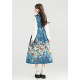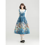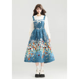幻想的な童話の世界に誘われたみたい。深みのあるブルーを基調とした生地に描かれたカラフルな花々が印象的なドッキングワンピース。ジャンパースカートとブラウスを組み合わせたデザインで、胸元にはリボンが飾られています。まるでキャンバスに描かれた風景画のような繊細なグラデーションが美しく、アートな雰囲気が漂います。