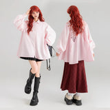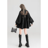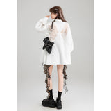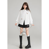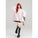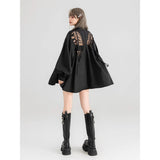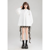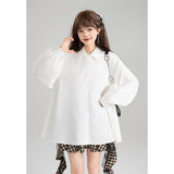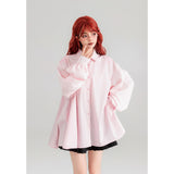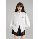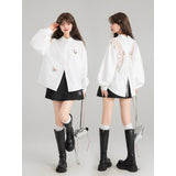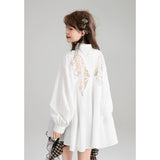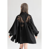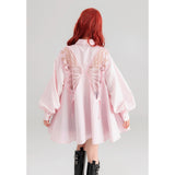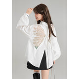 背中に蝶々の羽をイメージした透かし刺繍を施したブラウス。前から見るとシンプルなオーバーサイズシルエットのシャツ風で、ふんわりとした袖が特徴的。後ろ姿で大きく広がる羽のようなデザインが、幻想的かつロマンティックな雰囲気を漂わせています。