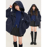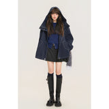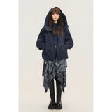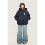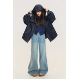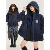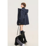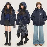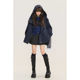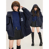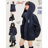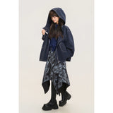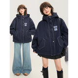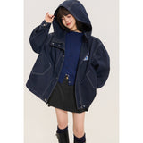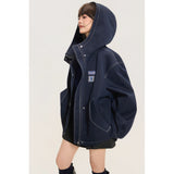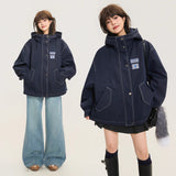 ネイビーを基調としたオーバーサイズフーデッドジャケット。しっかりとした生地感に、ホワイトのステッチがアクセントとして際立ち、立体的なシルエットを強調しています。大きなフードとドロップショルダーがリラックス感を与えつつ、フロントにはジップとスナップボタンを備えた実用的なデザイン。さらに、大きめのフラップポケットがワークテイストを添えています。胸元にはパッチワーク風のワッペンがあしらわれ、カジュアルでストリートライクな印象を演出しています。
