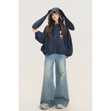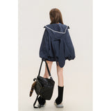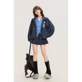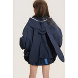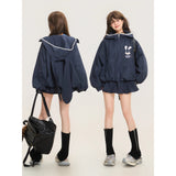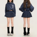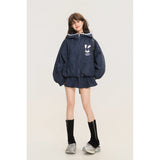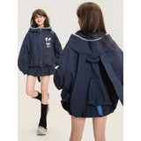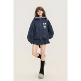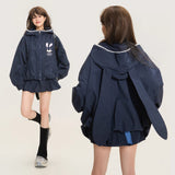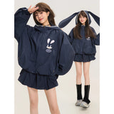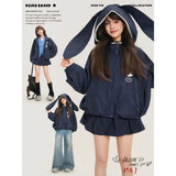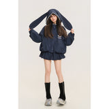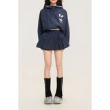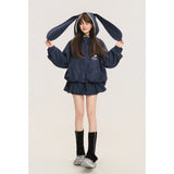 ネイビーカラーを基調とした遊び心のあるデザインが特徴的なマウンテンパーカーとショートスカート。マウンテンパーカーは、フロントにはウサギの顔のワッペンが施され、フードには長いウサギ耳が付いた個性的なデザイン。裾や袖はふんわりとしたボリューム感のあるシルエットで、ストリート感と可愛らしさを両立しています。ショートスカートはアンダースカート付きとなっています。