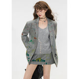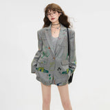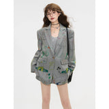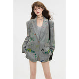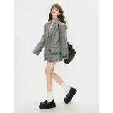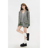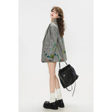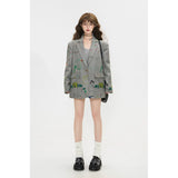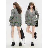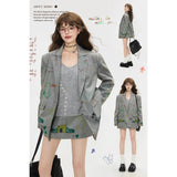 遊び心あふれる落書き風のカラフルなイラスト柄が散りばめられたジャケットとショートスカート。ジャケットはオーバーサイズシルエットで、クラシックなテーラード感を残しながら、子どものスケッチのようなユーモラスなモチーフが随所に描かれており、ストリート感とアート性を融合させたデザイン。ショートスカートも同じ生地で仕立てられ、ポップな絵柄が全体を軽快で遊び心のある印象に仕上げています。無邪気な落書き調の柄が映える、アート感覚のユニークなセットアップ。