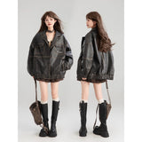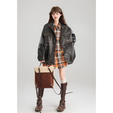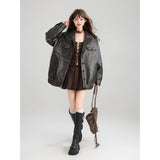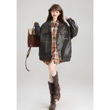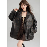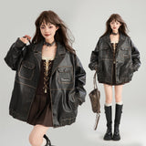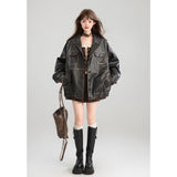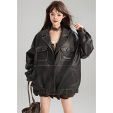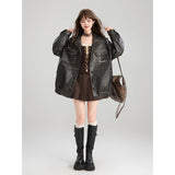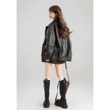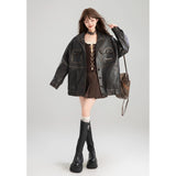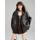 ちょっと強めの私で歩く、無造作なかっこよさ。レザーの存在感と、少女らしさのバランスで魅せるオーバーサイズシルエットのフェイクレザージャケット。まるで映画の主人公みたいに。マットな質感にシワ感のある加工が施され、ユーズドライクな風合いを演出。フラップ付きの大きめポケットがフロントに並び、左胸には刺繍ロゴがアクセントになっています。