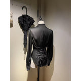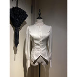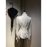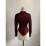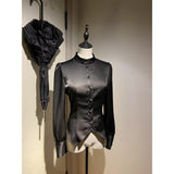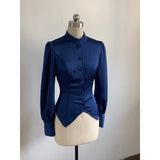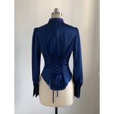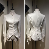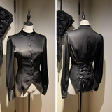 クラシカルで上品な印象を放つ、ハリのある光沢サテンを使用したブラウス。立ち襟と前立てのくるみボタンが凛とした佇まいを演出し、後ろ身頃には編み上げリボンが施され、ウエストを美しく引き締めるコルセットデザインに。袖口にもくるみボタンがあしらわれており、ディテールまで統一感のある仕上がりとなっています。