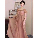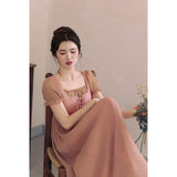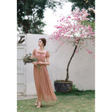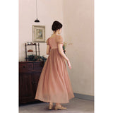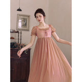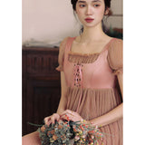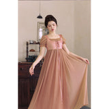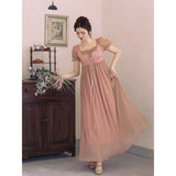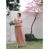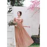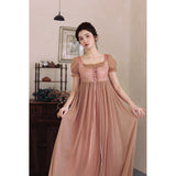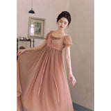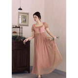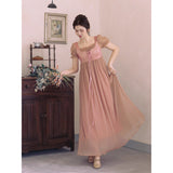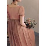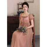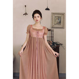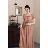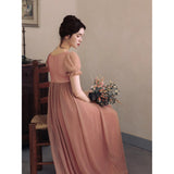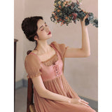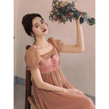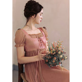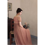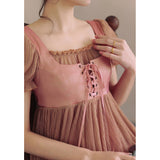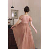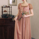 ルネサンス期の肖像画から抜け出してきたような、儚げで優雅なワンピース。胸下からふんわりと広がるエンパイアシルエットが特徴的。胸元のレースアップデザインとパフスリーブが、ヴィンテージな可憐さを引き立てます。