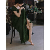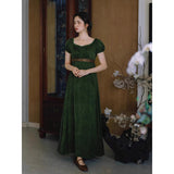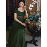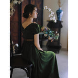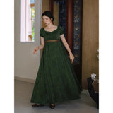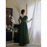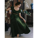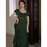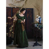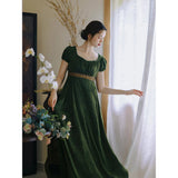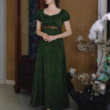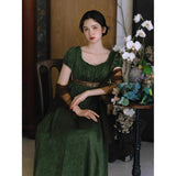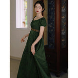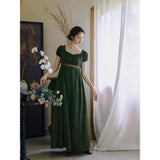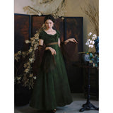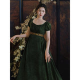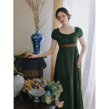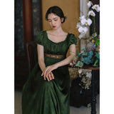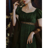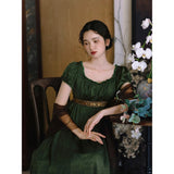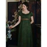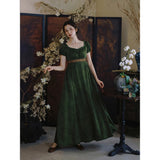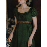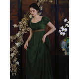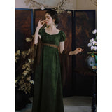 19世紀ヨーロッパの優雅な貴婦人みたいに演出してくれるエンパイアワンピース。深みのあるグリーンカラーが落ち着いた雰囲気を放っています。上半身はギャザーがたっぷり入った柔らかなシルエット。ウエスト部分にはアンティーク調のゴールド刺繍入りブレードがあしらわれ、クラシックな重厚感を加えています。袖はパフスリーブで可憐さをプラスしつつ、全体は高貴で上品な印象を放ちます。気品と幻想を纏ったクラシカルなアイテム。