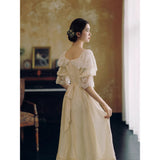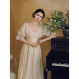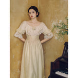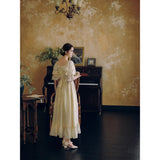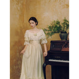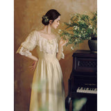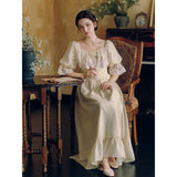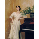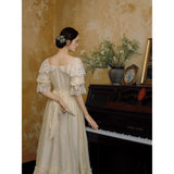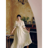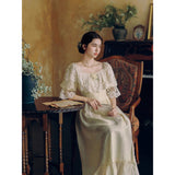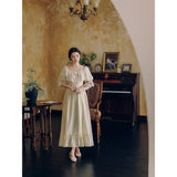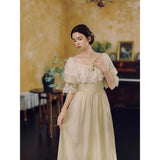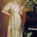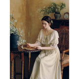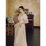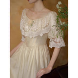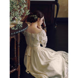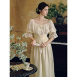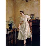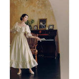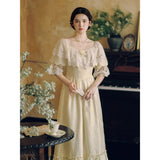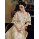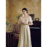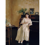 繊細なレースをたっぷりとあしらった、クラシカルな生成り色のロングワンピース。柔らかな光沢を帯びた生地が上品な雰囲気を纏い、肩から胸元にかけて広がるレースフリルが優美な陰影を描きます。胸元の花飾りやパールのネックレスとも調和し、まるで19世紀の貴婦人を思わせる気品漂う佇まい。ウエストの切り替えから流れるスカートはふんわりと広がり、アンティークの室内装飾と相まって、時を超えたような優雅さを演出しています。