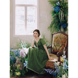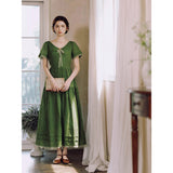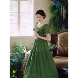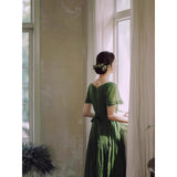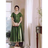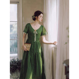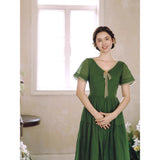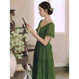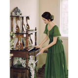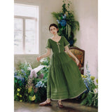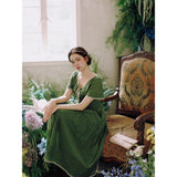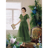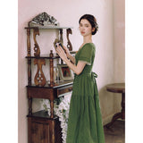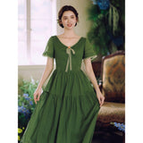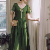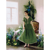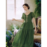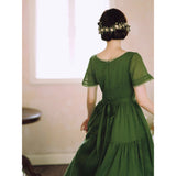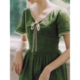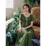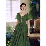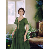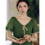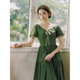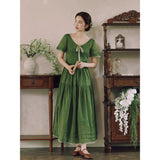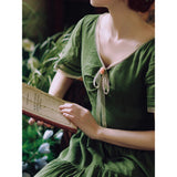 アンティーク調の気品を宿したエレガントなワンピース。深い森を思わせる落ち着いたグリーンが印象的。胸元には繊細なチュールリボンと小さな花飾りが添えられ、可憐で優美なアクセントになっています。軽やかな半袖と涼やかな素材感が、柔らかな風をまとうようにナチュラルな雰囲気を漂わせます。切り替えの入ったウエストから広がるギャザースカートはふんわりと揺れ、クラシカルでありながらも清楚な佇まいを引き立てます。