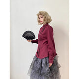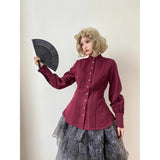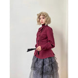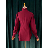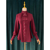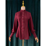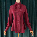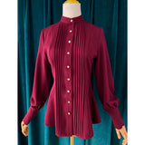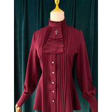 中世ヨーロッパの貴族のお嬢様みたいな雰囲気のプリーツブラウス。控えめなスタンドカラーとフロントの細かいプリーツ、くびれを引き立てるシルエットが特徴的。十字架が装飾された胸飾りがついています。高貴な雰囲気を漂わせたお嬢様に。