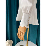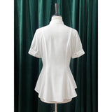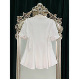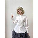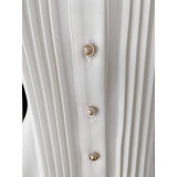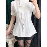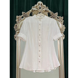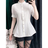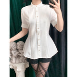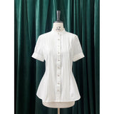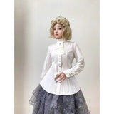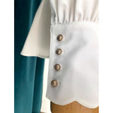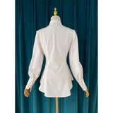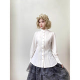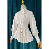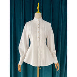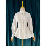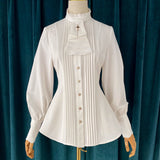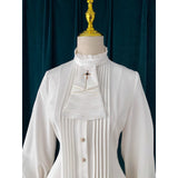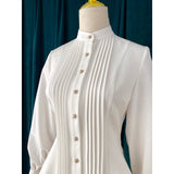 中世ヨーロッパの貴族のお嬢様みたいな雰囲気のプリーツブラウス。控えめなスタンドカラーとフロントの細かいプリーツ、くびれを引き立てるシルエットが特徴的。十字架が装飾された胸飾りがついています。高貴な雰囲気を漂わせたお嬢様に。