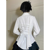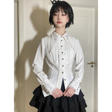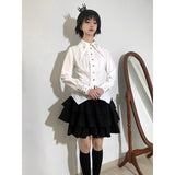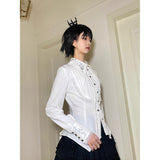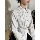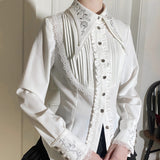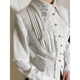 中世ヨーロッパの貴族のお嬢様みたいな雰囲気の刺繍ブラウス。襟部分には十字架と薔薇が刺繍されており、袖口は折り返されて、蔦が刺繍されています。胸部分はフリルとプリーツとレース刺繍が装飾されています。華麗な雰囲気を漂わせたお嬢様に。