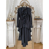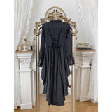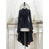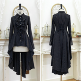 中世貴族のお嬢様みたいに演出してくれるヴィクトリアンテールブラウス。フロントには華やかなフリルが縦にあしらわれ、クラシカルで存在感のあるデザイン。ウエスト部分は絞られており、後ろには編み上げリボンで調整できるディテールが施されています。裾はアシンメトリーに長く広がり、動きに合わせて揺れるドラマティックなシルエットが特徴的。袖口には複数のボタンが並んでいます。華麗な雰囲気を漂わせて。