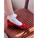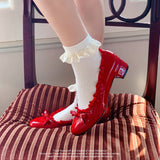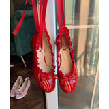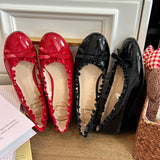 等身大の日常の中に、予想外の遊び心を。光沢感のあるエナメルが印象的なパンプス。縁にフリルが施され、つま先にはリボンがあしらわれており、クラシックでガーリーな雰囲気に演出してくれる。履くだけで気分が上がる。