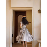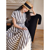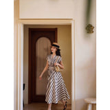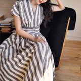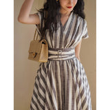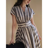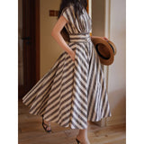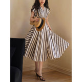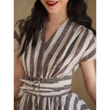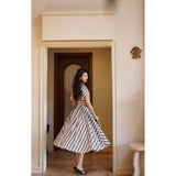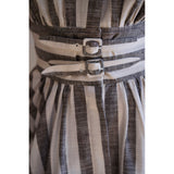 煤茶色の縦縞ヘップバーンワンピース
