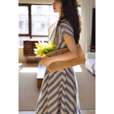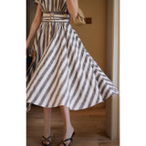 1950年代のパリの街中を優雅に闊歩したくなる。ふわりと広がるフォルムが美しいストライプ柄のワンピース。たっぷりの生地量で優雅に揺れるワンピースを纏うと、まるで映画女優みたいに。幅の広いウエストベルトが存在感を引き立ててくれる。控えめなエレガンスを演出してみて。