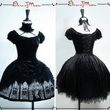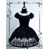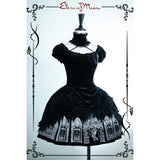 漆黒の夜にそびえ立つゴシック大聖堂をそのまま閉じ込めたかのような、神秘と祈りをテーマとしたワンピース。重厚なブラックのベルベットは夜の静寂を思わせ、裾一周に描かれた精緻な建築モチーフは、尖塔やアーチ、ステンドグラス越しの物語を想起させます。オフショルダーのデザインと首元のチョーカーは、どこか儀式的で神秘的な気配を漂わせ、背面のコルセットレースアップは中世の装束を思わせるクラシカルな緊張感を演出。ふんわりと広がるスカートは夜会のドレスのようでありながら、どこかダークファンタジーの世界観を纏っています。