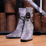 夜のサロンや舞踏会の余韻を閉じ込めたようなブーツ。ベルベットが静かな艶をまとい、足首に沿ってすっきりと立ち上がるシルエット。ヒールには透明感のあるジュエルをあしらい、彫刻のような存在感を持ちながらも全体の線を崩さず、クラシカルで少し幻想的な空気を漂わせています。繊細なパールチェーンと宝石のような装飾がくるぶしを囲むようにあしらわれ、視線は自然と装飾的なヒールへと導かれます。