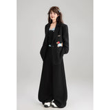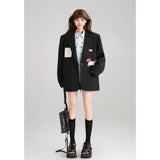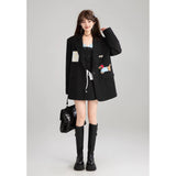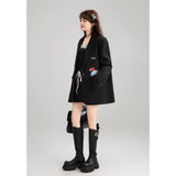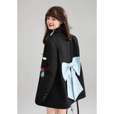 黒を基調にしたオーバーサイズのテーラードジャケット。直線的なシルエットにさりげない遊び心を重ね、フロントには小さなモチーフや子犬のワッペンが点在し、背面には淡い水色の大きなリボンが大胆に配されています。端正さと甘さが同居した印象を生み出し、マニッシュな構造の中に物語性と可憐さを忍ばせた、視線が自然と後ろ姿に引き寄せられるようなジャケット。