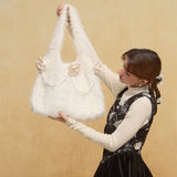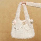 ふんわりとしたファーが愛らしくさと上品さを醸し出してくれるファーバッグ。フロントには艶めく椿の花があしらわれ、可憐な気品を醸し出しながら、しとやかに咲く冬椿のような存在感を放ちます。さらに、花々を結ぶように施された繊細なパールの装飾が、静かなロマンティシズムを漂わせ、どこか物語のヒロインを思わせる印象に。