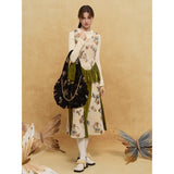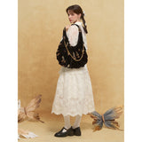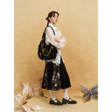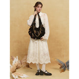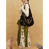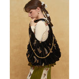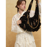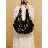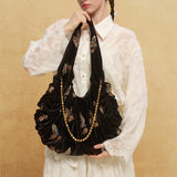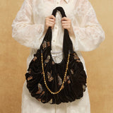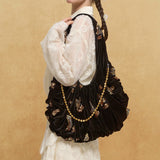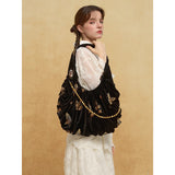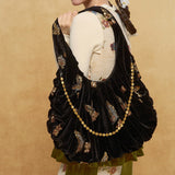 深い夜のヴェルベットのような漆黒の地に、金色の蝶が舞う幻想的なデザインのトートバッグ。柔らかく光を受けて輝く刺繍は、まるで羽ばたく瞬間を切り取ったかのように繊細。たっぷりとギャザーを寄せたフォルムは、まるで絵画のドレープのように優美で、見る角度によって表情を変える立体感が魅力。輝くチェーンがアクセントとなり、アンティークジュエリーのような気品を放ちます。クラシックとエキゾチックが溶け合うような、時の流れを超えたロマンを感じさせるアイテム。