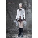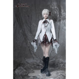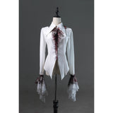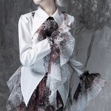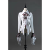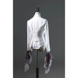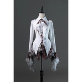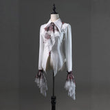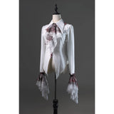 血飛沫と退廃的な白が織りなす、耽美で妖艶なブラウス。手元へ向かうほどに広がるレースの袖には、滲むような血塗れの模様が散っており、指先の動きを一層ドラマティックに演出してくれ、幻想の舞台衣装のようなドラマティックさを漂わせます。背面のレースアップが気高い貴族の装いを思わせます。儚さと狂気が同居する、退廃のロマンスを象ったアイテム。