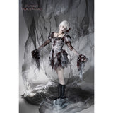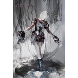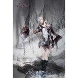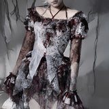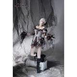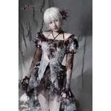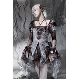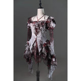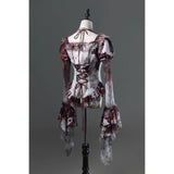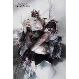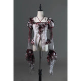 血飛沫と退廃的な白が織りなす、耽美で妖艶なブラウス。ボディを包む布地には、滲むような血塗れの模様が散っています。胸元を縁取るフリルは繊細に波打ち、首元に走るリボンが儚い束縛を思わせます。袖は透けるレースの階層が幾重にも重なり、指先まで流れるように落ちるそのラインが、幻想の舞台衣装のようなドラマティックさを漂わせます。背中のレースアップが身体を美しく引き締め、見る者を引き込むような緊張感を纏ったデザイン。儚さと狂気が同居する、退廃のロマンスを象ったアイテム。