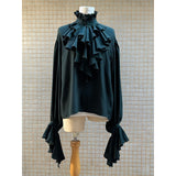 ドラマティックで気品漂うヴィクトリアンブラウス。胸元から流れるようにあしらわれた幾重ものフリルが、クラシカルなロマンティシズムを感じさせます。高く立ち上がるラッフルネックが顔まわりを華やかに引き立て、ボリュームスリーブが優雅な雰囲気を醸し出しています。