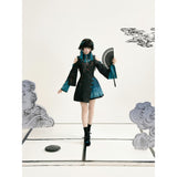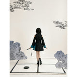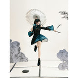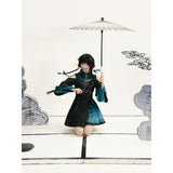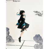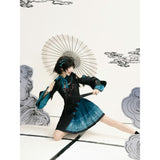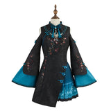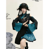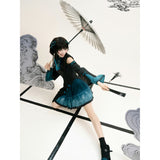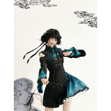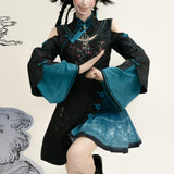 武侠世界の少女剣士を思わせる、ダークファンタジーなチャイナワンピース。黒地に繊細な刺繍が施され、ターコイズブルーの袖口やプリーツスカートのグラデーションが幻想的。肩のカットアウトやチャイナボタン、揺れる装飾が東洋的な美しさと戦うヒロインらしい力強さを同時に感じさせます。