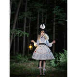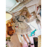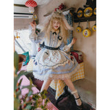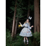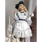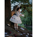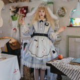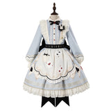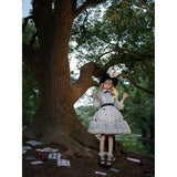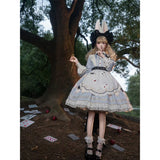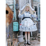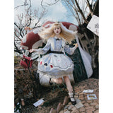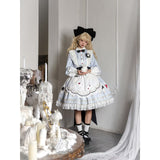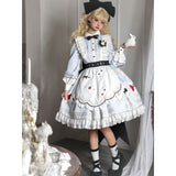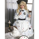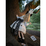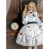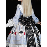 不思議の国のアリスの世界観を落とし込んだワンピース。ワンピースには、淡いブルー地にポーカーダイヤが描かれており、幻想的でロマンチックな雰囲気を細部から演出します。エプロンには、トランプの刺繍が散りばめられ、バックには大きな時計が描かれたリボンがあしらわれています。