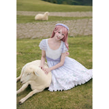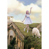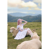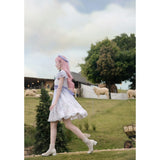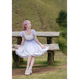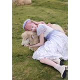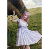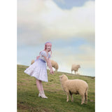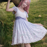 淡いラベンダーから白へと溶け合うような色調に、野の花を思わせる繊細なフラワープリントが広がるワンピース。胸元はすっきりと、肩には透け感のあるフリル袖がそっと風を含みます。ウエストをやさしく結ぶ同色のリボンがシルエットに静かな区切りを与え、歩くたびに軽やかに揺れるスカートの裾が空気と戯れるように広がります。無垢さと物語性をまとった、穏やかで夢見心地な一着。