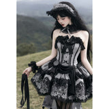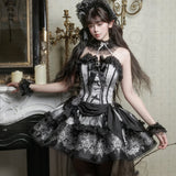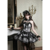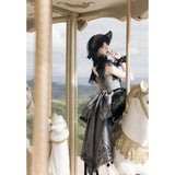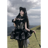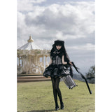 古い洋館の奥で時を止めたまま佇むドールを思わせます。退廃的でありながらどこか儚く、幻想的な美しさをまとったジャンパースカート。黒と銀を基調に、光を吸い込むようなレースと艶のある生地が重なり合い、コルセットのように身体に沿う身頃が人形のように整った輪郭を描き出しています。幾層にも重ねられたスカートが揺れるたびに静かなドラマを生み、リボンや透け感のある素材が甘さと緊張感を同時に宿しています。