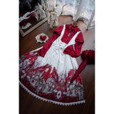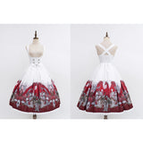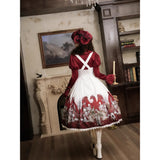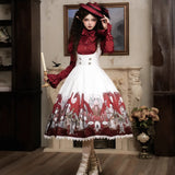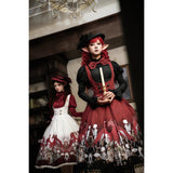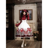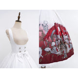 中世ヨーロッパの“死者の舞踏”を彷彿とさせるジャンパースカート。骸骨の周囲には百合の花が咲き誇っており、死と再生、純潔の象徴として描かれています。裾に向かって広がる重厚なスカートラインは、歩くたびに優雅に揺れます。退廃と優美が交差する、美しくも儚い"百合の物語"を完成させてください。